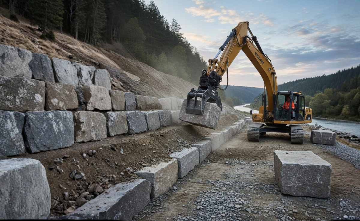 Nous avons conçu un mur en enrochement cyclopéen de 25 mètres de long. À l’aide d’une pelle de 8 tonnes avec pouce hydraulique, chaque bloc de basalte a été sélectionné et imbriqué avec précision pour assurer un drainage naturel optimal. Ce chantier allie sécurité structurelle et intégration parfaite dans l’environnement naturel des hauts de l’île. »
